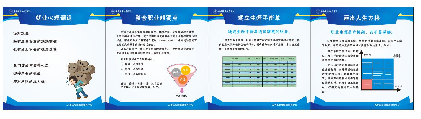 在举办就业心理讲座的同时,在学校宣传栏展出“就业心理调适”展板,为毕业季学生的心理适应提供普适性支持与帮助。